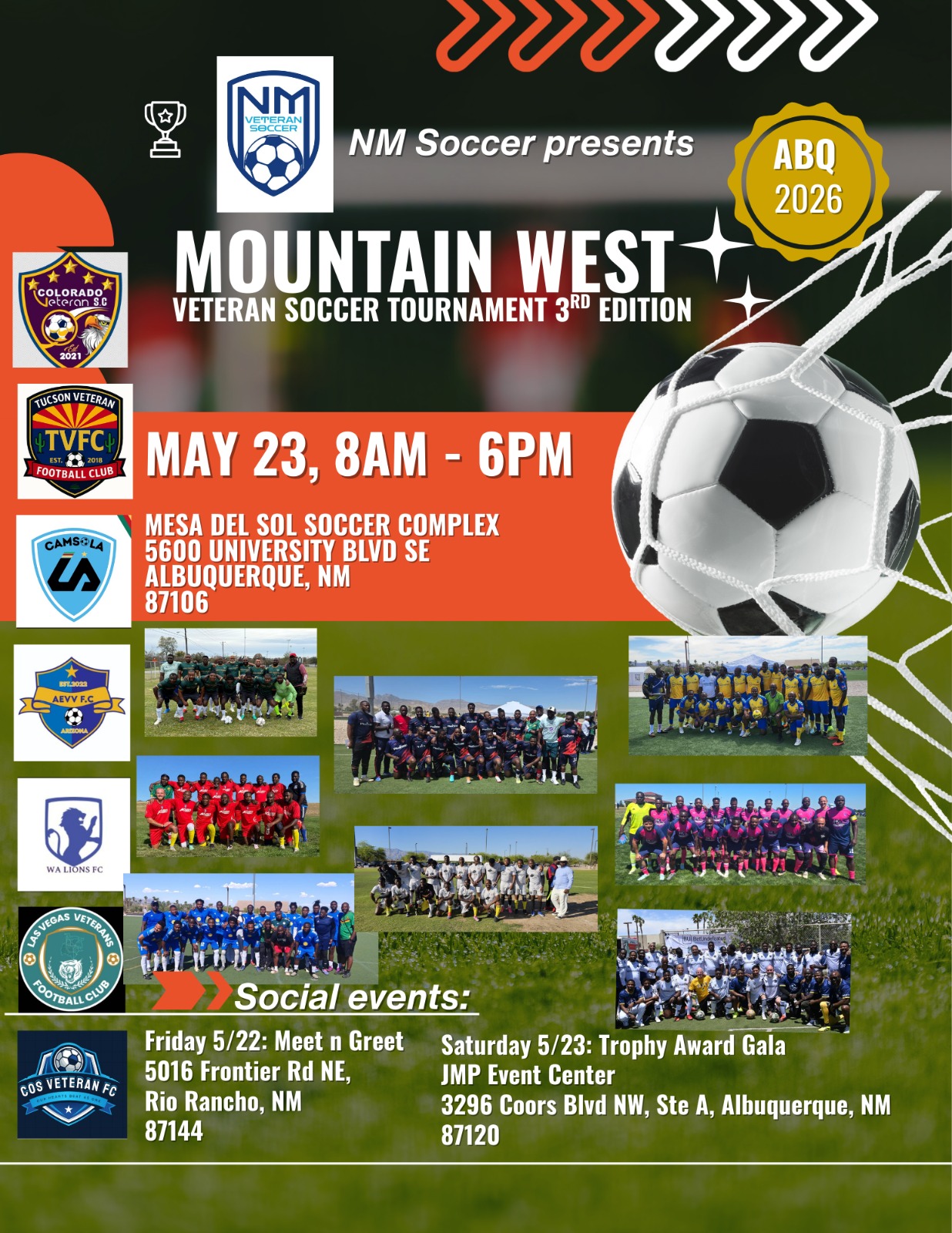 Presented by NM Soccer, this regional veteran tournament features multiple participating clubs and a full day of matches at Mesa Del Sol Soccer Complex. For the time being, the event format can be described as a three-game tournament for each participating team.